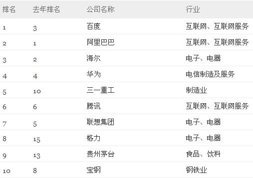 榜单显示,本年度“最受赞赏的中国公司”共分全明星榜和行业榜单两类,全明星榜前五强分别为百度、阿里巴巴、海尔、华为和三一重工,而所有上榜的50家公司中工程机械行业仅有三一重工上榜。在“制造业”分行业榜中,三一重工则居于首位,其次分别为徐工机械、李宁、中国航天科技集团和中国航空工业集团。