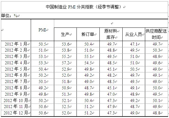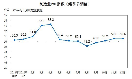 2012年12月中国制造业采购经理指数为50.6%