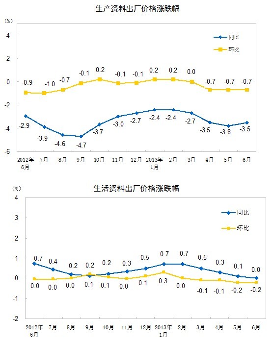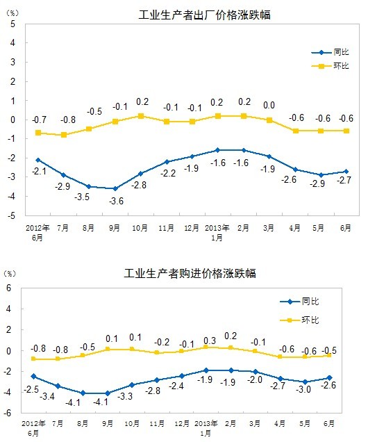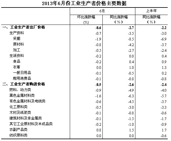 2013年6月份,全国工业生产者出厂价格同比下降2.7%,环比下降0.6%。工业生产者购进价格同比下降2.6%,环比下降0.5%。上半年,工业生产者出厂价格同比下降2.2%,工业生产者购进价格同比下降2.4%。