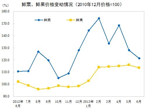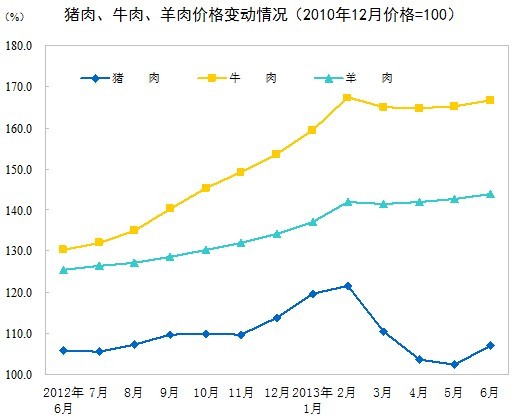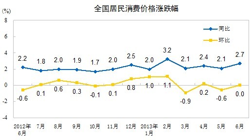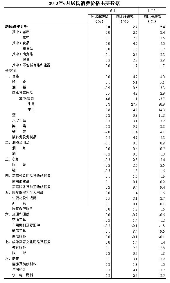 转载 2013-07-10 08:59 中华人民共和国国家统计局 来源:中国集装箱行业协会 2013年6月份,全国居民消费价格总水平同比上涨2.7%。其中,城市上涨2.6%,农村上涨2.8%;食品价格上涨4.9%,非食品价格上涨1.6%;消费品价格上涨2.6%,服务价格上涨2.7%。上半年,全国居民消费价格总水平比去年同期上涨2.4%。