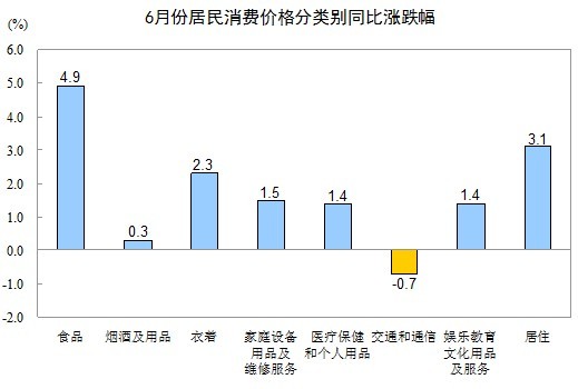 6月份,食品价格同比上涨4.9%,影响居民消费价格总水平同比上涨约1.59个百分点。其中,肉禽及其制品价格上涨4.8%,影响居民消费价格总水平上涨约0.34个百分点(猪肉价格上涨1.1%,影响居民消费价格总水平上涨约0.03个百分点);鲜菜价格上涨9.7%,影响居民消费价格总水平上涨约0.26个百分点;鲜果价格上涨11.4%,影响居民消费价格总水平上涨约0.22个百分点;粮食价格上涨5.1%,影响居民消费价格总水平上涨约0.15个百分点;水产品价格上涨3.1%,影响居民消费价格总水平上涨约0.08个百分点。