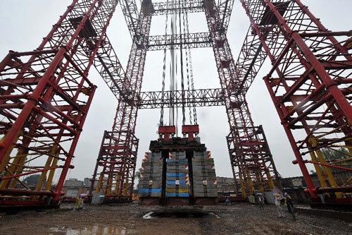 7月12日,6400吨液压复式起重机在进行复式提升试验。