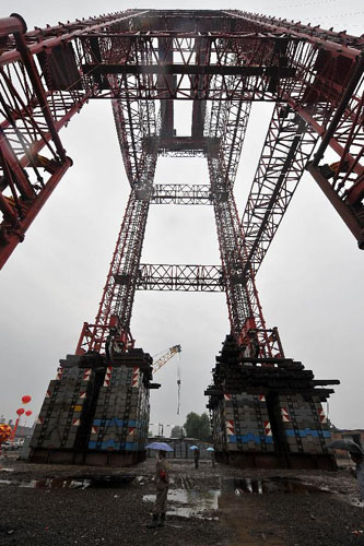 【解说】该设备犹如一个“变形金刚”,具有可独立使用和拆分使用的灵活工况组合,整机可分为单双门架两大工况,每种工况又可以具有不同跨度、高度的组合。单门架工况可满足反应器的分段吊装,拆分为两台3200吨液压门式提升系统,又可以一机多用,满足化工行业对起重设备的特殊要求。在拆分和组装设备时,设备的300多根弦杆与1680多根腹杆均可任意组装。