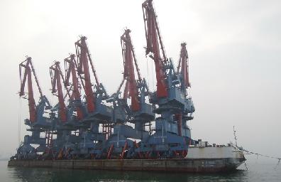 8月21日11时,烟台打捞局“德浮15002”驳船整体装载9台门机,在两艘拖轮的拖带下,离开青岛港前往印度尼西亚。