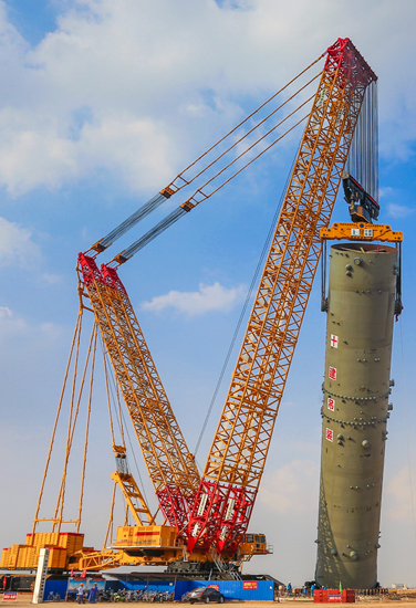 7月,徐工世界第一吊XGC88000履带起重机在中石化烟台某工业园区项目中,现场以108米重型主臂,33米固定副臂,在作业幅度30米,额定载荷1790吨的工况下,顺利起吊总重达1680吨的丙烷塔。完美首秀后,XGC88000立即被分装运输,跋涉1600多公里,横跨半个中国来到神华宁煤400万吨/年煤炭间接液化项目的施工现场。