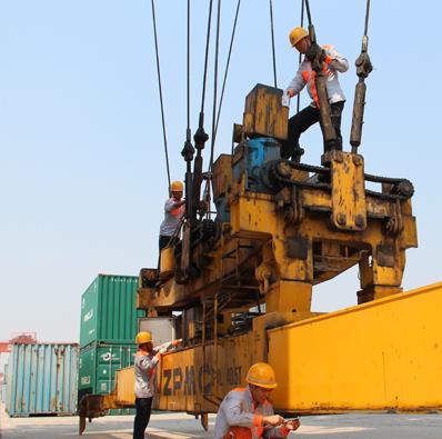 图为4名维修工正在对大型龙门吊吊具进行检修作业。