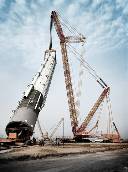 8月11日,上午9时57分,宁夏,中国在神华集团煤制油项目中,徐工研制的全球最大4000吨级履带起重机,轻松将重达2155吨、高54.4米、直径9.6米的油品合成装置费托合成反应器缓缓吊起就位。