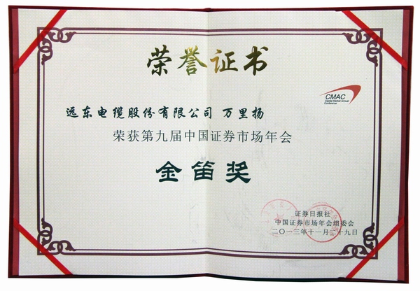 11月29日,第九届中国证券市场年会暨颁奖典礼隆重召开。远东电缆股份有限公司董秘万里扬在近2500位主板上市公司董秘中脱颖而出,继获得“金牌董秘”、“百佳董秘”等殊荣后,再度斩获本届“金笛奖·年度最佳董秘”这一重磅奖项。
