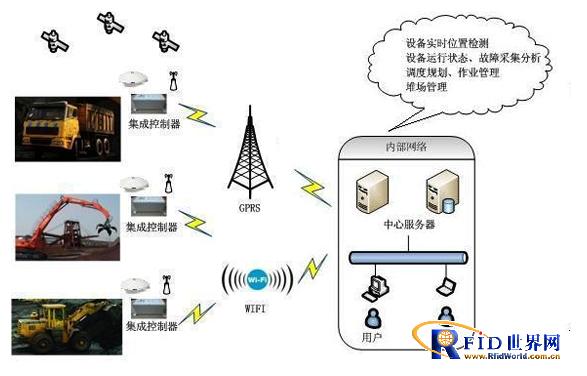 将集成控制器安装在机械设备的司机室,采集设备的位置信息与运行状态等数据。通过GPRS或WIFI网络将数据传送至管理服务平台,平台上运行定位和堆场管理服务软件,提供图形化显示、调度规划与堆场管理功能,通过B/S或C/S的客户端给各用户提供服务。