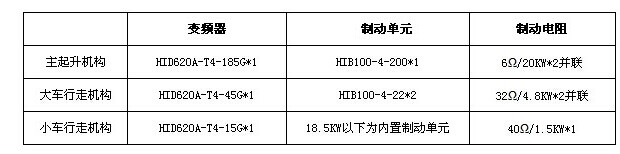 合康变频根据现场实际情况,考虑到本类起重机的总工作时间并不长,能够方便维护,综合两者的性价比后,本项目采用第一种处理方案,具体制动单元及电阻器的选型请参考合康变频《HIB100制动单元选型说明》。