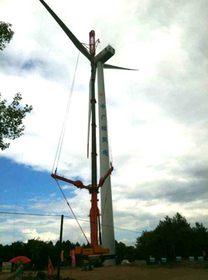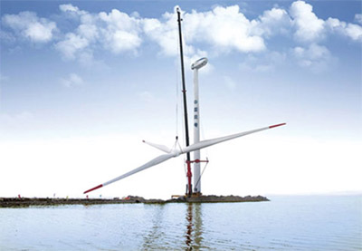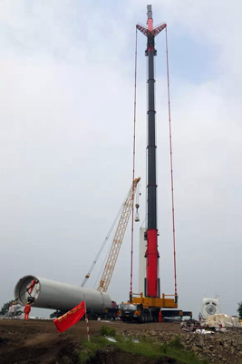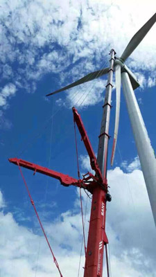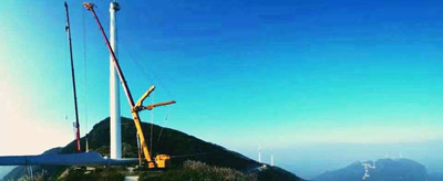 大连西中岛风电场位于渤海湾西中岛,是中广核风电公司辽宁分公司成立以来的首个项目,三一SAC6000克服了地形复杂、植被茂密、路险坡陡等风机设备道路运输困难和山地吊装中常遇的浓雾、暴雨、大风等众多影响,顺利完成吊装。