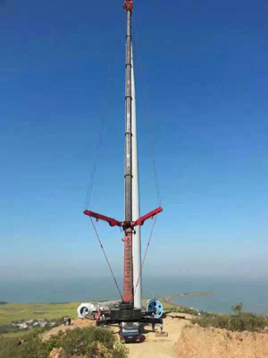 三一SSC1020全地面特种起重机参与中广核“城顶山风电场“的风电吊装工作,中广核城顶山风电场的2.0MW风力发电机塔筒高约83.5米,三一SSC1020特种起重机6+3节起重臂全伸高度可达100米,轻松完成2.0MW风力发电机的起吊安装工作。