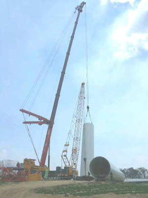 三一第一台千吨级起重机SAC12000为上海电气在安徽天长高邮湖进行2.0 兆瓦风电吊装项目,在长达半年的施工过程中,SAC12000安全高效完成各项吊装任务,其中难度最大的一吊是主臂起吊2.0 兆瓦风电机舱组件稳稳提升至83 米的高空,起吊重量达100 吨。获得了客户的高度好评。