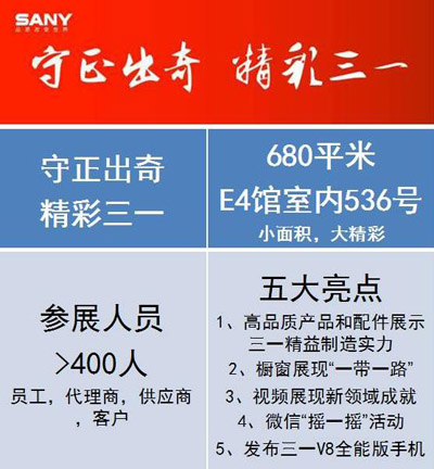 其三,展会现场将通过微信“摇一摇”签到及抽奖活动,打造三一好交道,易购买的亲和力形象。同时,突显三一集团拥抱互联网,积极转型,利用互联网时代的思维与文化,尝试商业模式的创新,构建起企业新的卓越运营体系,打造全新竞争力。
