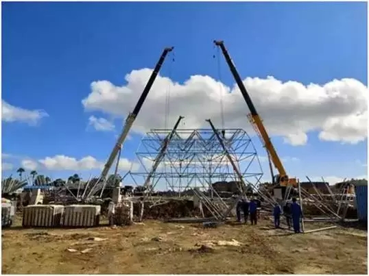 印度尼西亚卡巴那岛,4台徐工QY25K5-I汽车起重机在镍还原项目二期原料库进行网架主体安装协同吊装