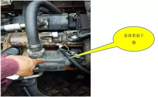 根据客户反映的情况,首先从最简单的进行检查,启动机车。由于当前吊具旋锁未完全解锁,起升是无动作的,所以暂无法测试出大泵起升的最大压力值,然后测试小泵的压力在加大油门时压力表读数最大值:130bar至135bar压力之间,显然低于机车铭牌规定的195bar压力。在检查的同时偶然发现一个非常重要的现象:小泵的泵体表面很干燥,触摸表面有发烫的感觉,而大泵表面有少量的油渍,暂没有发烫的感觉。因为当前吊具旋锁连锁的保护未有起升动作,通常液压泵泵体表面有少量油渍属正常现象,而泵体表面干燥温度偏高说明泵有异常,初步确定小泵工作异常而建立不起泵压力。