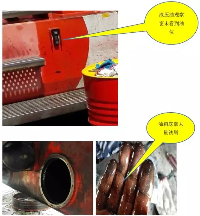 1.首先检查液压油箱的油量发现油箱观察窗口看不到液压油的油量。观察其他个别液压油缸油封均有轻微的渗油;