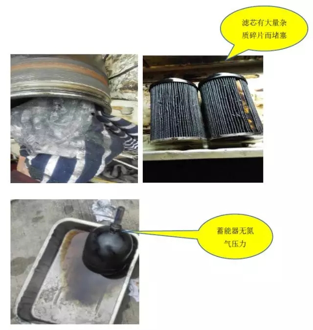 4.拆解蓄能器检查发现无氮气压力,有液压油流出,并且油质浑浊。
