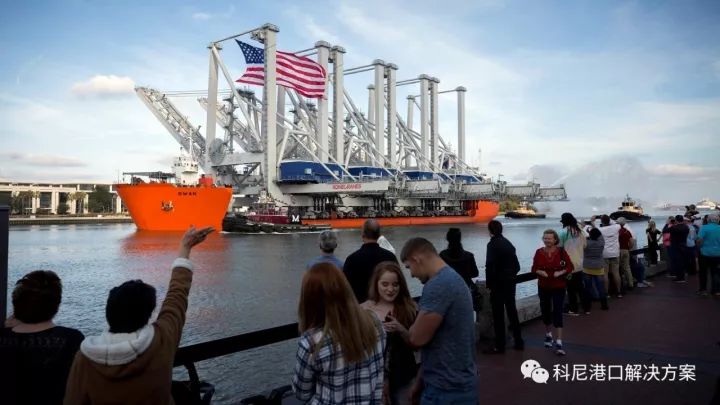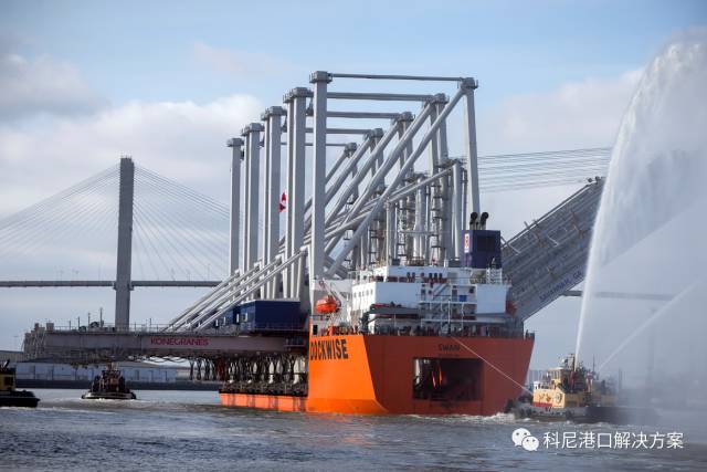 2017年11月22日清晨,萨凡纳河上的拖船驶向大海,迎接载着四台大型科尼岸桥的重吊船天鹅号。这些新巴拿马型起重机的高度足以提升码头上方152英尺的集装箱。每台岸桥的起重能力为72吨。目前前大梁端部距离码头表面192英尺。随着前大梁提升安装到最终位置并俯仰,岸桥将达到412英尺高。新的起重机将使萨凡纳的岸桥数量增加到30台。另外6台科尼岸桥将在2020年到达。当所有岸桥交付后,此次升级将使得美国最大的单一集装箱码头每小时装卸近1300个集装箱。