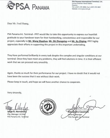 巴拿马当地时间1月12日,振华重工与PSA巴拿马国际码头举行后4台岸桥的签字交机仪式,标志着振华重工为该码头建造的8台岸桥提前近一个月实现零整改交机。PSA巴拿马国际码头总经理Mr.Alessandro Cassinelli一行出席交机仪式。