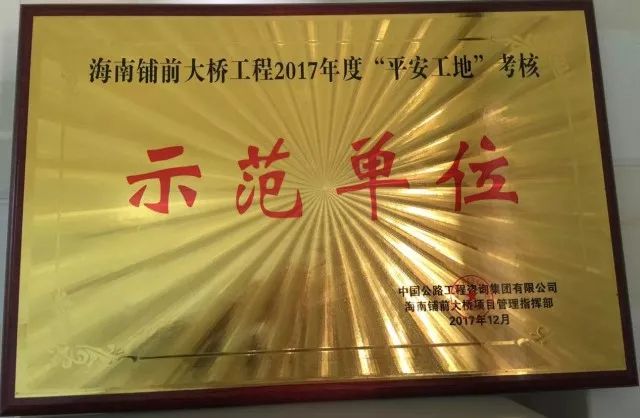 1月10日,海南交建局和海南铺前大桥指挥部通报2017年度铺前大桥项目总体工程“平安工地”考核评选结果,振华重工承制的海南铺前大桥第三标合同段荣获海南中资指挥部表彰的“平安工地”考核示范单位称号。