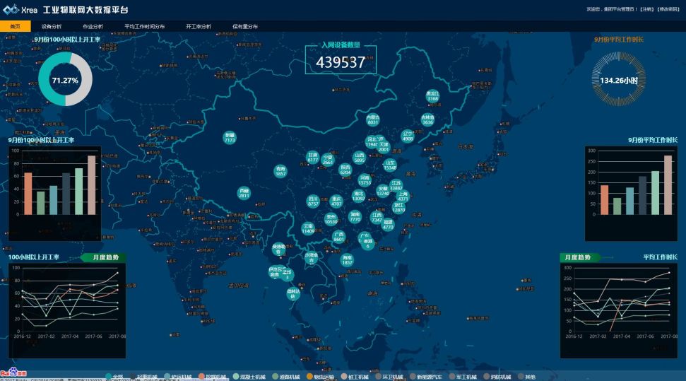 入网44万台设备,累计工作时长18亿小时,这是Xrea工业互联网平台的“大数据”。通过平台的电子大屏幕,能够监测到公司生产的每辆车的运行情况。