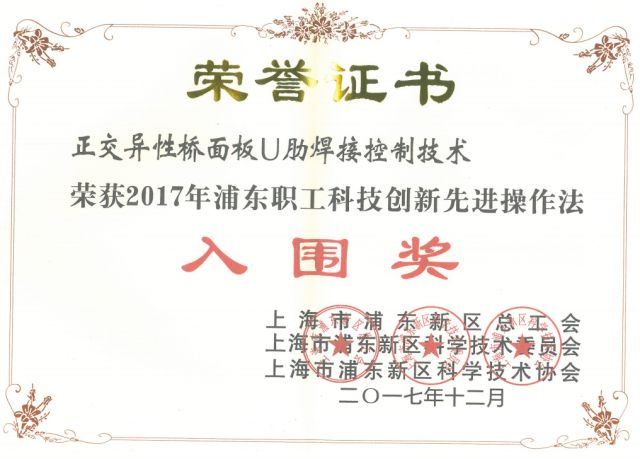在2017年浦东新区职工科技创新评选活动中,海工集团钢结构事业部副总工程师周维申报的“正交异性桥面板U肋焊接控制技术”、“大型风电管桩锥圆卷制升级革新”,分别荣获“科技创新先进操作法入围奖”与“科技创新成果入围奖”;钢结构事业部许金明荣获“科技创新英才入围奖”。