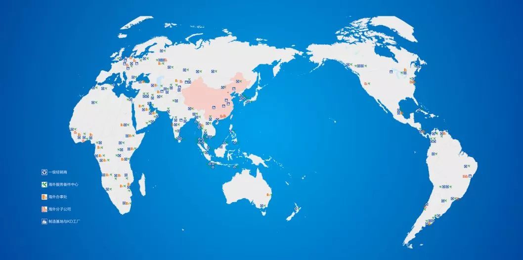 徐工在全球拥有40多家分支机构,300家经销商,出口覆盖全球178个国家和地区