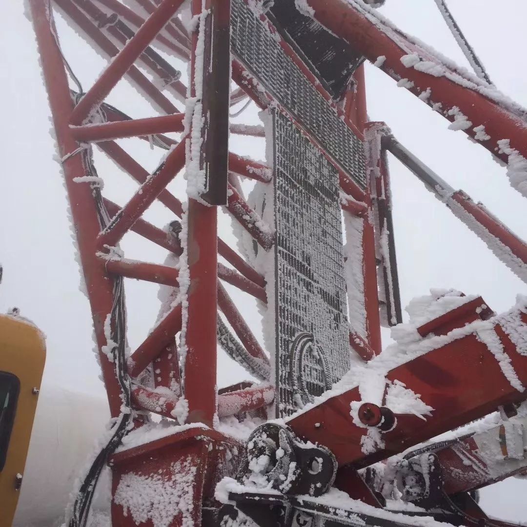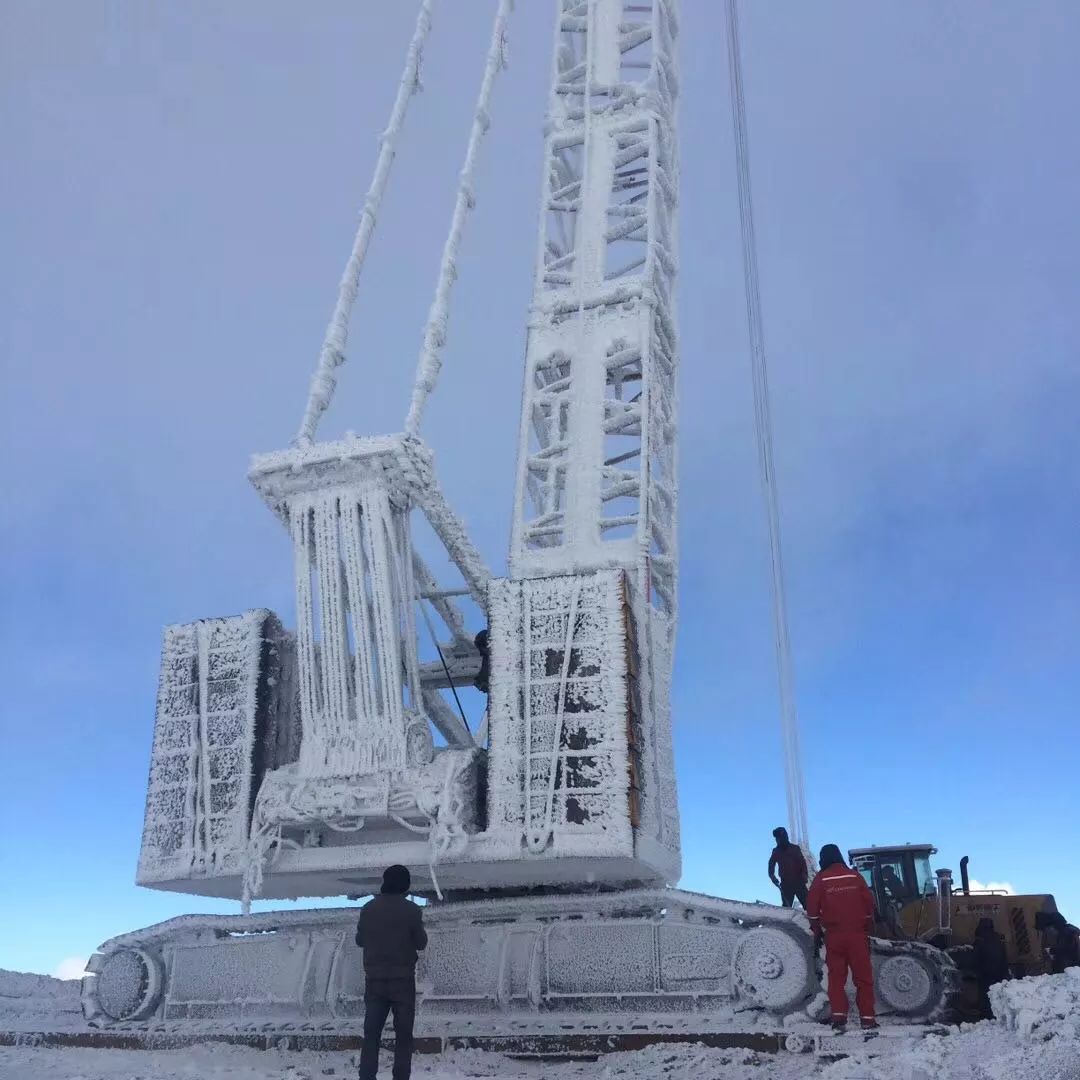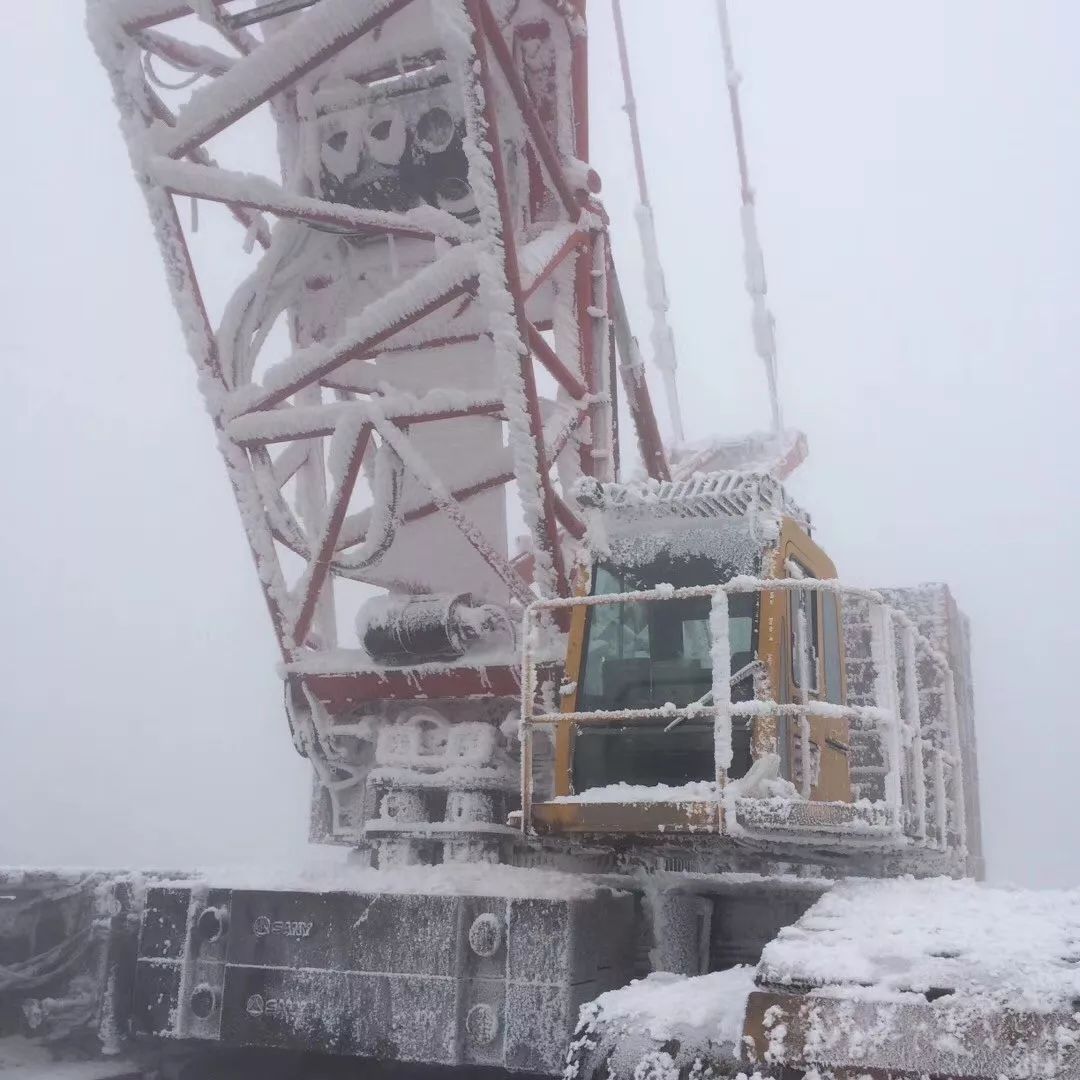 在海拔3600米的地方工作不是一件容易的事,尤其是整个工期大部分都处于冬季,更让施工难上加难。这里最低温可以达到零下25℃,最大风速达到25米/秒,风一吹过,整个履带起重机就会被裹上一层厚厚的白色外衣,20厘米的冰层一点都不稀奇。再加上山上多雾,抬头望去,高大的吊臂很快就隐藏在了浓浓的雾里。