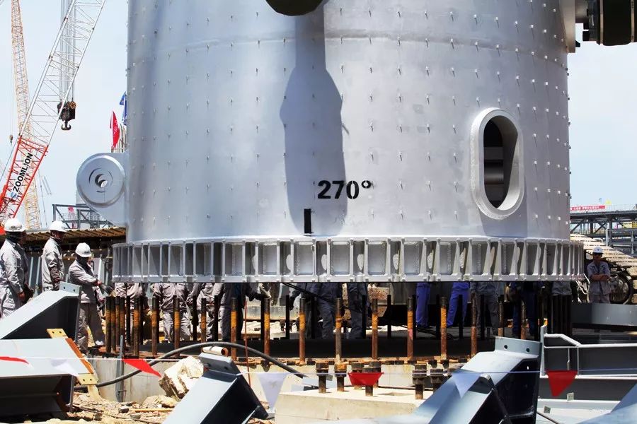 ▲即将被吊的庞然大物:净重达1308吨的石化反应器