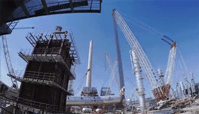 ▲中联重科3200吨履带吊正在吊装净重1308吨的反应器