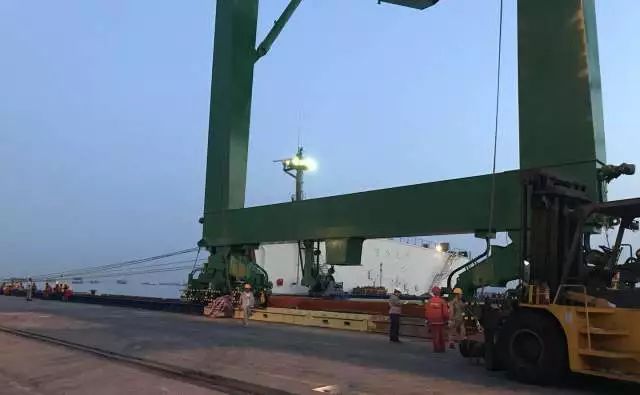 电影《敦刻尔克》大撤退的一幕还在眼前,振华重工卸船团队就在敦刻尔克码头与潮差展开了一场激烈的“战斗”。“振华24”轮运载着1台法国用户的岸桥和2台荷兰用户的岸桥,还未抵达敦刻尔克码头,用户便给出离泊时间为6月11日中午12点,若无法按时离开,则必须延后靠船时间。为保证设备的按时交付,卸船小组决定在1小时内完成卸船任务。6月10日,敦刻尔克码头潮差将近8米,大潮差对于卸船时间要求紧迫,不容有失。雪上加霜的是该项目岸桥的海、陆侧有两条轨道不在一条直线上,整个卸船过程仅有1小时的时间,还需要花费近半个小时调整轨道。这陡然增加了卸船难度,更何况整个过程不得有一丝差池。卸船船队经过精密的计划,制定以半小时为单位的卸船方案,船、岸人员各司其职,紧张有序地把岸桥安全卸至码头,最终仅仅用了50分钟便完成卸船任务,受到用户及监理一致赞誉。
