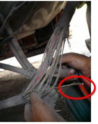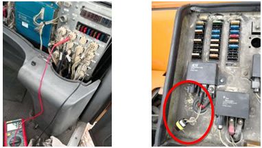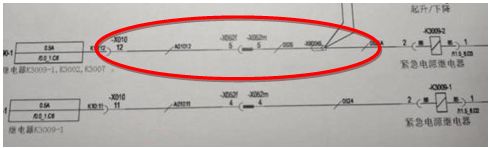 由电路图及检查测量电压可知,K3009-2的86脚(0525线)无电压,维修人员可确定设备电缆线(0525线)出现断路。经对电缆检查后,发现车身底盘下电缆线磨损,0525线断开,如下图: