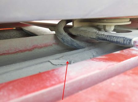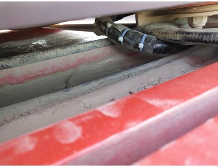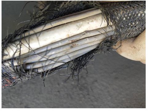 维修人员根据电气原理图检查K3009-2继电器控制线路A01012,测得报出现故障报警后的线路无电压,继电器未吸合,检查对地电阻无异常。维修人员在消除65#报警重启后重新检查,测得线路电压正常,为24伏。维修人员继续检查线路K3009-2线圈插头到驾驶室D790-1的K10:12插脚之间电缆,发现驾驶室底部与线束拖链位置摩擦破损,如下图: