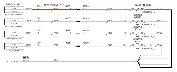 现场维修人员查阅DRT450正面吊的维修手册故障代码表,65#故障代码解释为:因电气线路的短路或断路,驾驶室主控制器KCU保护电路自动切断K3009-2继电器的控制电源,导致供应吊具KDU的紧急电源F58-3保险组失电,吊具无动作。此部分的电气原理图如下: