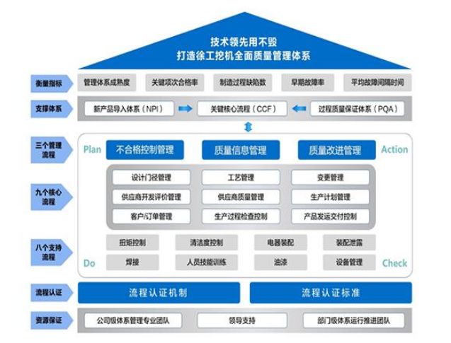 徐工挖机、徐工液压紧跟国家制造业高质量发展规划,持续改进,深度强化卓越绩效管理。其中,徐工挖机自2011年导入卓越绩效模式以来,紧紧围绕领导、战略、顾客与市场、资源、过程管理、测量分析与改进以及经营结果七个方面进行全面对标分析和诊断评价,综合运用精益、六西格玛等先进方法持续改善提升,推动公司经营管理成熟度不断提高,核心竞争力持续增强,多次荣膺“全国实施卓越绩效模式先进企业”称号。