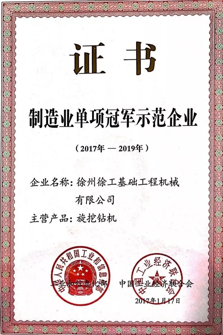 2017年徐工基础被工信部和中国工业经济联合会评为“制造业单项冠军示范企业”,是行业首批唯一获此殊荣的企业。