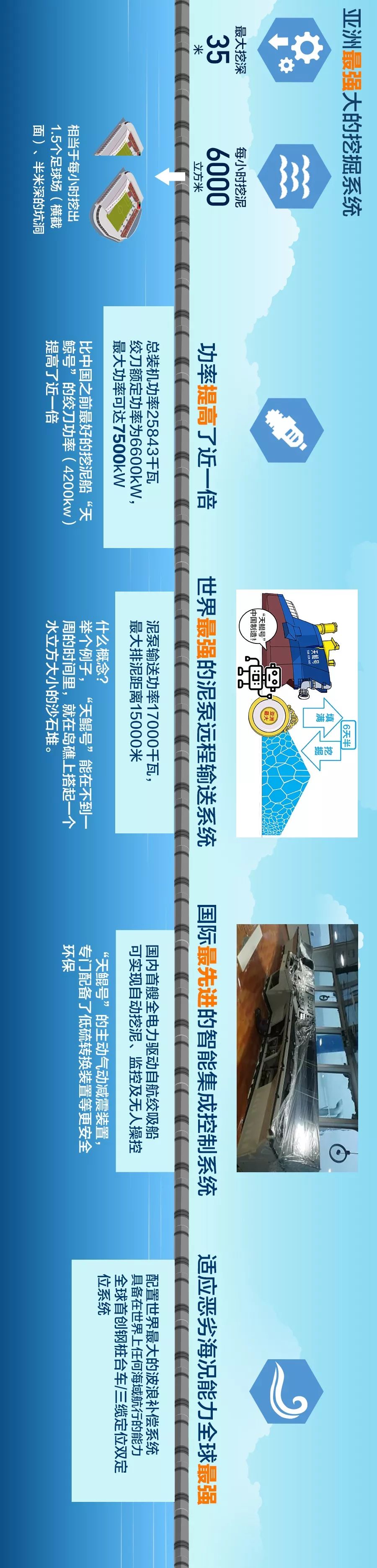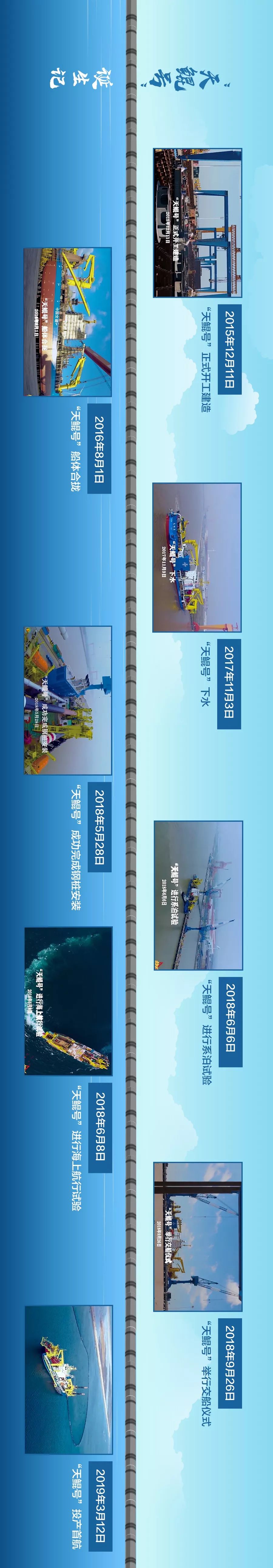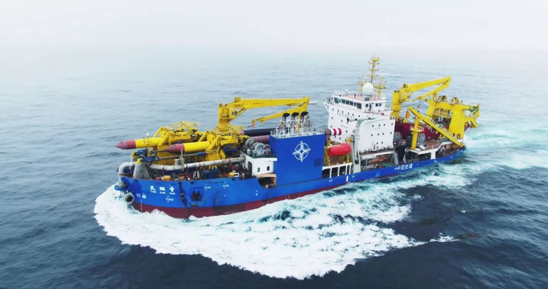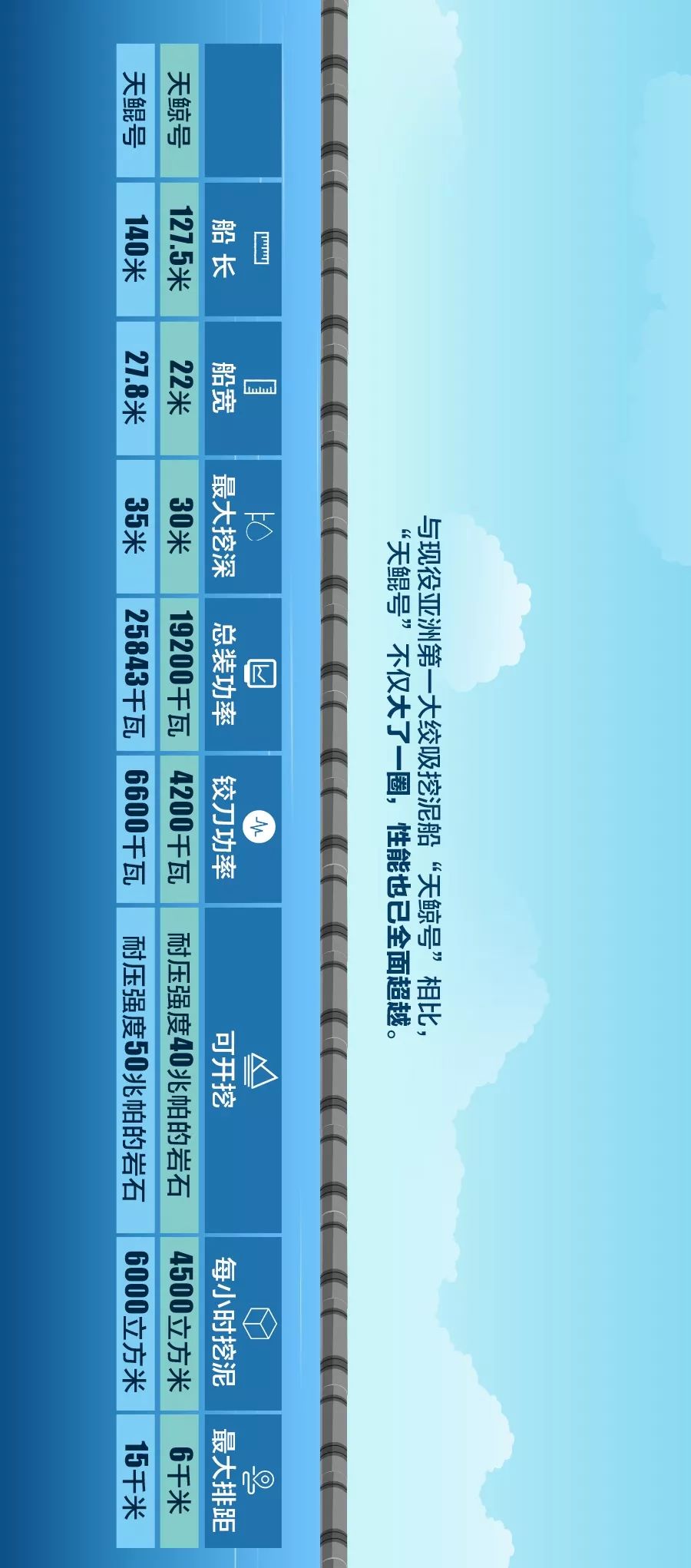 “天鲲号”由中交天津航道局投资、振华重工建造、入籍中国船级社。“天鲲号”船长140米 、宽27.8米 、挖泥深度6.5米至35米,绞刀总功率6600千瓦,是世界上最先进、亚洲最大绞吸挖泥船。2015年,项目在振华重工启东海洋工程公司开工建造,历时3年完工交付。