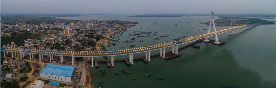 海文大桥位于海南岛东北端东寨港出海口处,是连接海口和文昌两市的跨海大桥,大桥始自文昌市铺前镇,途经北港岛,止于海口市演丰镇塔市,接海口市江东大道,总投资约30.1亿元。大桥全长5.597公里,其中跨海大桥长约3.959公里,主桥长460米,塔高151.8米,全桥全线采用双向六车道一级公路标准建设,造型为“文”字形,寓意“文耀海天”。