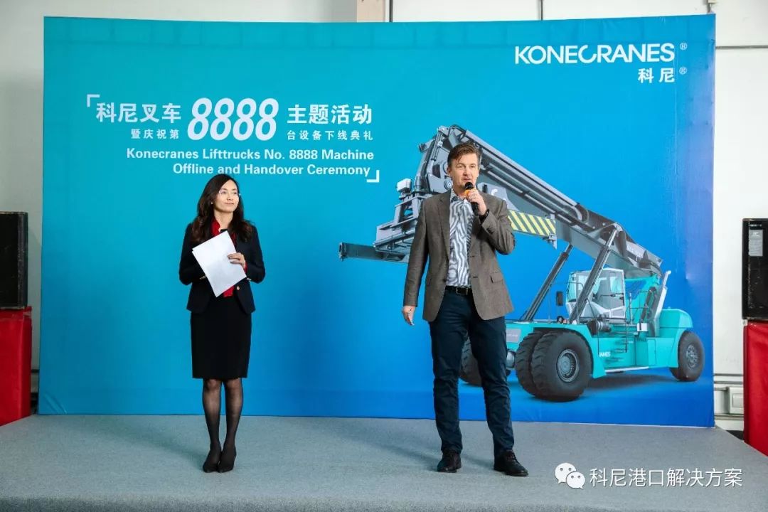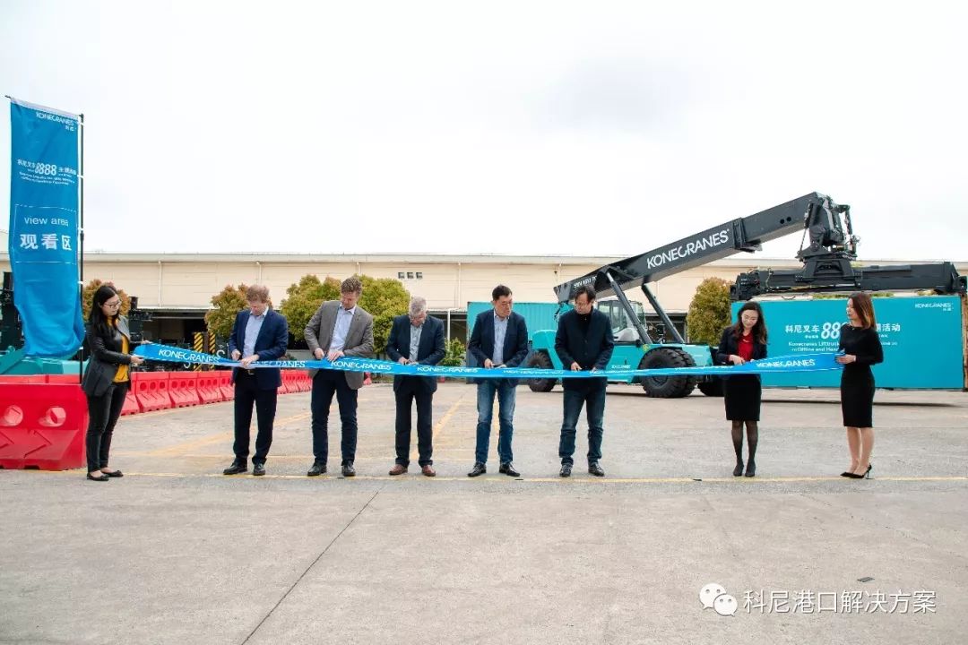 科尼集团执行副总裁兼港口解决方案负责人Mika Mahlberg先生、科尼集团副总裁兼重型叉车事业部总经理Andreas Falk先生、科尼重型叉车事业部供应链运营总监Conny Persson先生、科尼叉车中国区销售总监奚玮女士、科尼授权经销商KCL董事总经理罗瑞平先生和科尼授权经销商青岛林德港口机械有限公司总经理刘向前先生共同剪彩庆祝全球第8888台设备出厂。
