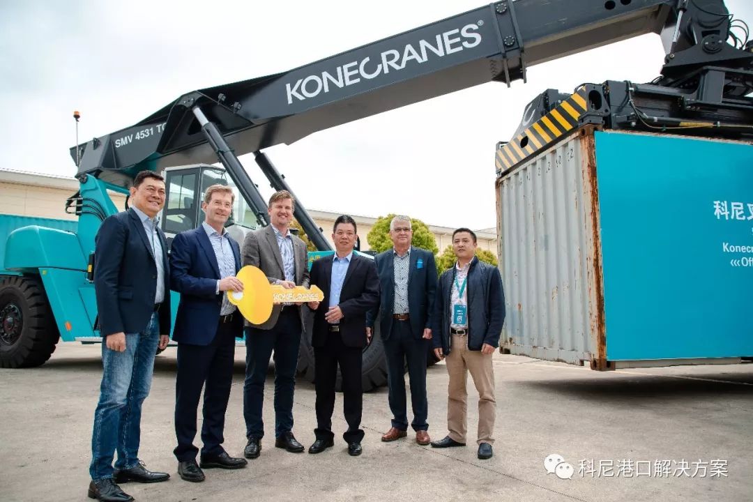科尼集团Mika Mahlberg先生、Andreas Falk先生、Conny Persson先生和科尼授权经销商KCL董事总经理罗瑞平先生将象征着友好合作的金钥匙交予厦门港海沧集装箱查验服务有限公司客户手中,完成交机仪式。