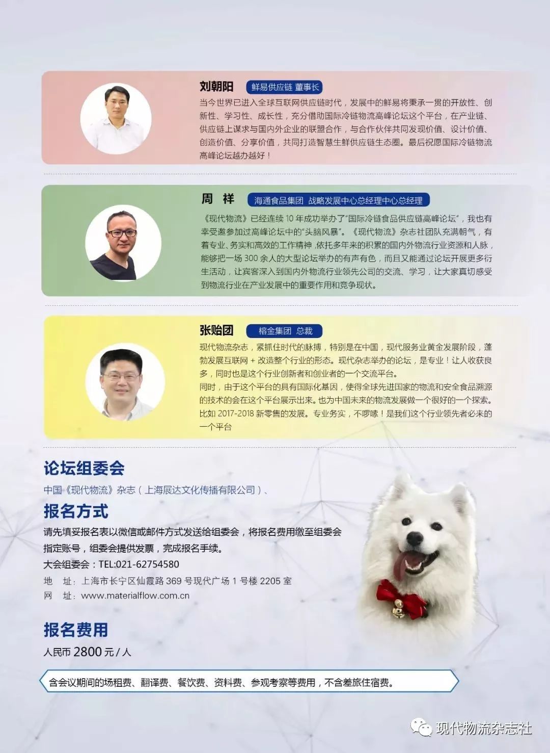 “国际冷链食品高峰论坛”自2008年起已连续举办至第十一届,已成为高端精品冷链论坛。论坛由中国《现代物流》杂志、台湾《物流技术与战略》杂志和日本《MATERIAL FLOW》杂志主办,得到上海、杭州、昆山、天津、郑州等地方政府联合主办和大力支持,吸引来自欧美日、东盟、港澳台地区等20多个国家及地区以及中国3800 多位冷链产业高管出席。