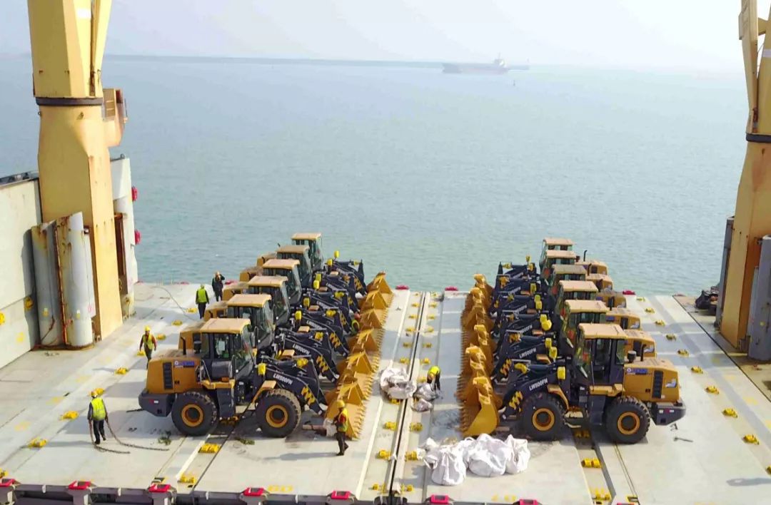 装载机、挖掘机、矿用自卸车等,随着吊装作业的开始,一台台徐工“重器”被依次装载至大型远洋巨轮上,整个装货时间仅用时43个小时。