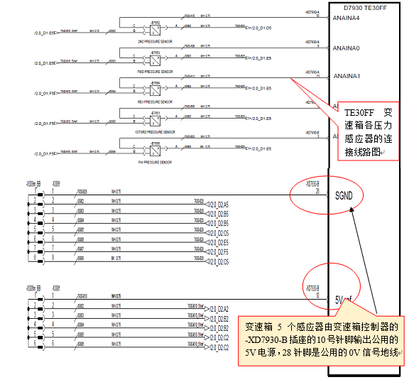 根据故障代码表和以上诊断菜单的数据,多个压力感应器同时出现压力过低报警,初步分析可能为变速箱各压力感应器公用的5V电源的问题,查看变速箱各压力感应器的电气图纸,排查故障原因: