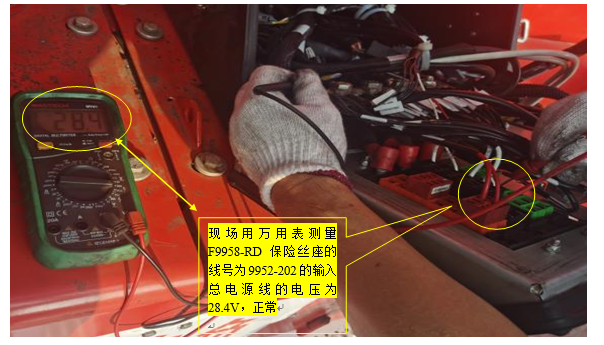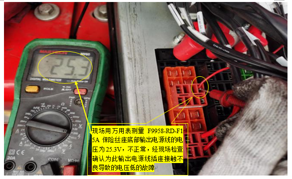 根据以上DRU机车变速箱控制器PPWR电源线的电气图纸,启动机车,现场对PPWR电源线进行检查测量。经检查确认为F9958-RD-F1 5A保险丝输出电源线在保险丝座的线插座处接触不良,导致电压过低的故障。