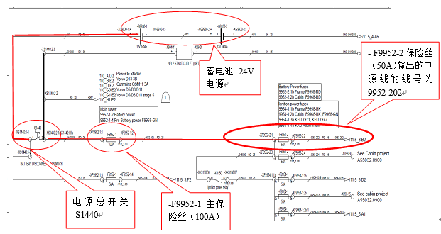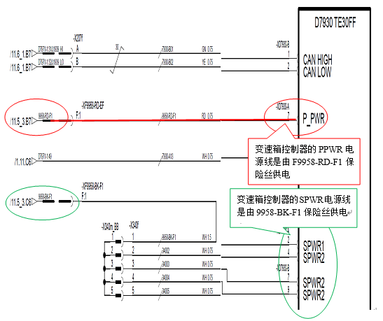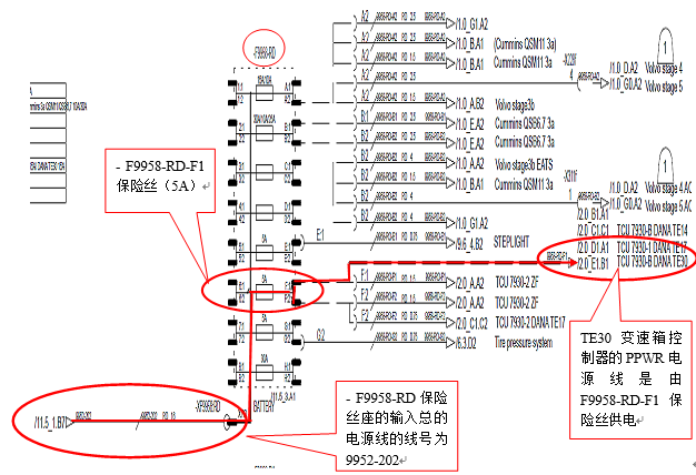 再次查看DRU450机车变速箱控制器的电气图纸,变速箱控制器D7930的固定电池电源(PPWR电源)的控制路径如下:机车电源总开关S1140 ————F9952-1主保险丝(100A)————F9952-2主保险丝(50A)————(线号9952-202)————F9958 -RD保险丝座————F9958-RD保险丝座的F1(5A保险丝)————变速箱控制器的XD7930A的第7脚(PPWR电源)