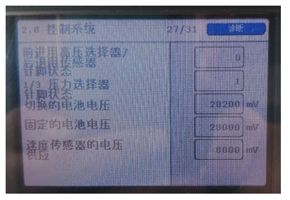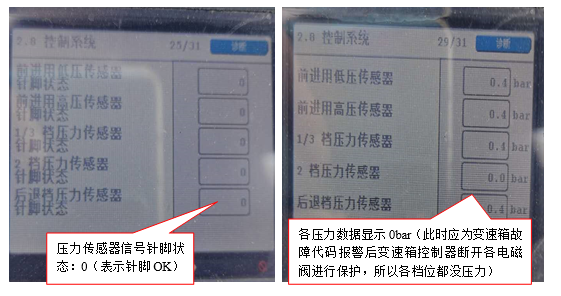卡尔玛专业人员根据故障代码的提示进入机车检查。驾驶室电门钥匙打开后,机车就出现上述故障代码。启动机车,查看机车变速箱诊断菜单里变速箱各压力感应器的数值,如下图: