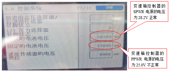 在检查变速箱各压力感应器及变速箱实际压力无异常后,启动机车,再次进入变速箱的诊断菜单里仔细查看各数据。这次检查发现,变速箱控制器的电源诊断菜单显示变速箱控制器固定的电池电压(PPWR电源—电瓶电源)仅25.0V,但变速箱控制器切换的电池电压(SPWR电源—点火钥匙电源)为28.2V,初步判断变速箱控制器电瓶电源PPWR不正常。