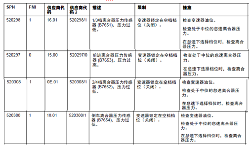 故障排查查阅卡尔玛DRU450正面吊的故障代码表,4个故障代码分别是变速箱1/3挡、2/4挡、倒车挡及前进挡离合器压力过低报警的的故障。