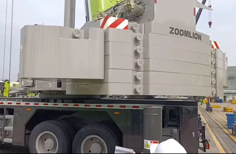 ZTC800E653起重机的总配重高达28t,包括:自带配重3t、5块4t活动配重和2块2.5t边配重,为行业同级产品中最重。此外,该起重机配备了无线遥控器,使用它仅需一个人就能快速完成配重的安装,非常方便。